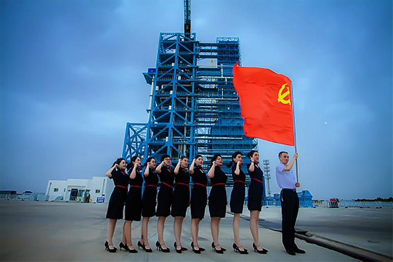 东风场区分行营业室员工在火箭发射台前开展党日活动。东风场区分行航天+航空+金融特色网点。