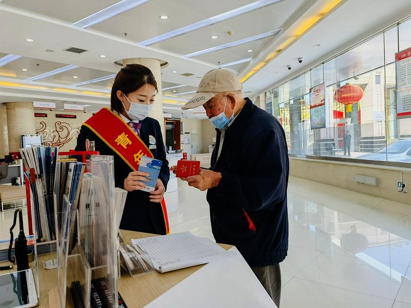 唐山凤凰支行员工向老年人介绍防假识骗知识。