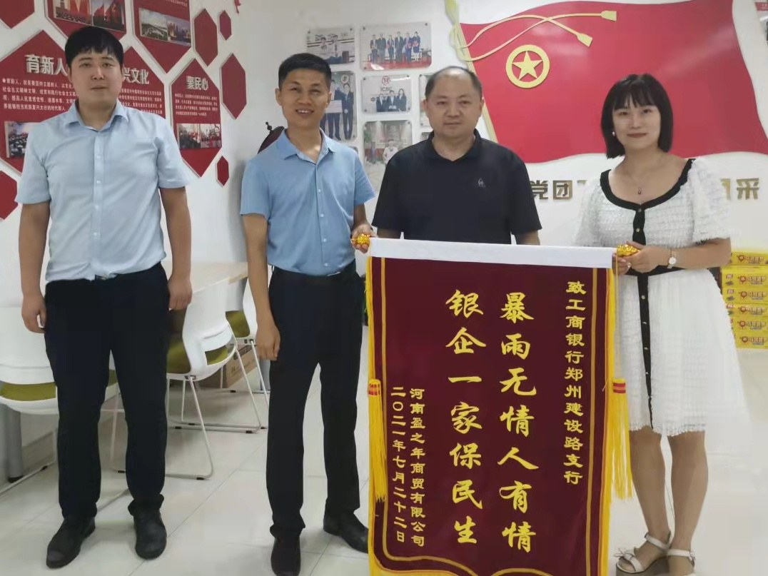 7月23日下午,河南盈之年商贸有限公司总经理、郑州市濮阳商会副会长王琳,将一面写着“暴雨无情人有情,银企一家保民生”的锦旗送到建设路支行行长邱峰手上,表达她对工行温暖相助的感激之情。盈之年公司是一家经销医疗器械的小商户,两天前受暴雨袭击,公司经营设施受损,急需融资恢复运营。该行闻讯后迅速抽调人员,上门了解其所需资金缺口,考虑到企业经营情况、信用情况良好,该行本着“急事急办、特事特办”的原则,在前期为该公司发放200万元信用贷款的基础上,再次为该公司增发贷款77万元,并提供优惠利率,满足了客户紧急用款需求。据王琳介绍,该笔业务从申请到投放,工行相关机构上下联动,克服断电断网的不利影响,每个环节争分夺秒,实现了业务随报随批,前后台协同推进,精简流程环节,高质高效服务企业抗灾,用最短时间帮助企业度过了难关。“工行服务不仅有速度,更有温度!”王琳连声赞叹道。