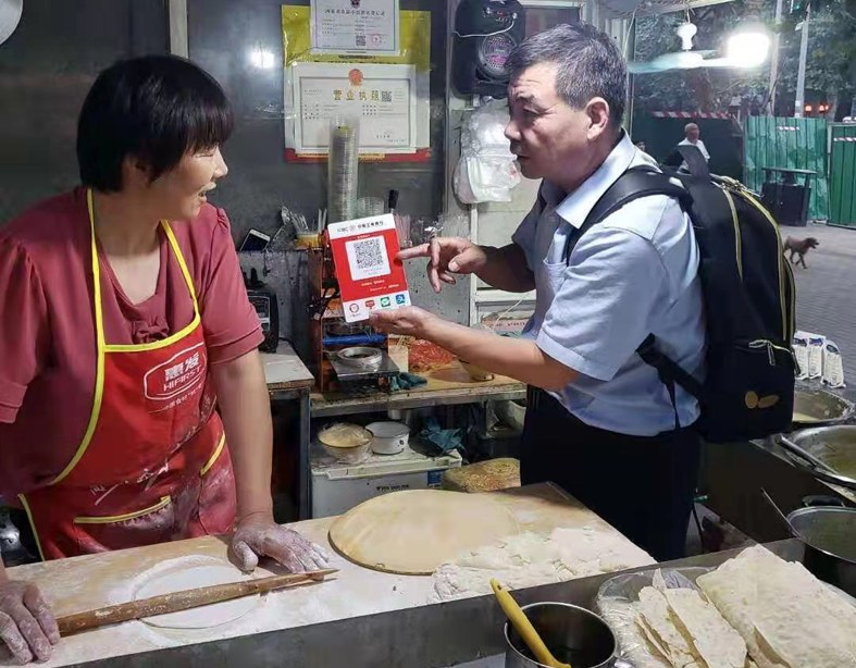 “丁晓伟劳模工作室”领衔人丁晓伟利用晚上,到夜市摊点营销e支付码。