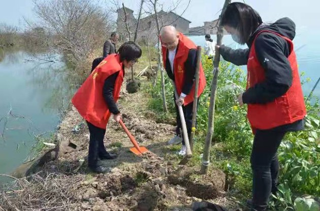 工行浙江省台州湾新区支行党总支积极发挥党建引领作用,倡导植绿护绿爱绿理念,近日在椒江区横河陈村组织开展了“红心绿行”主题党建植树造林公益活动。图为支行班子成员、政治生日党员共11人,参加了此次活动。