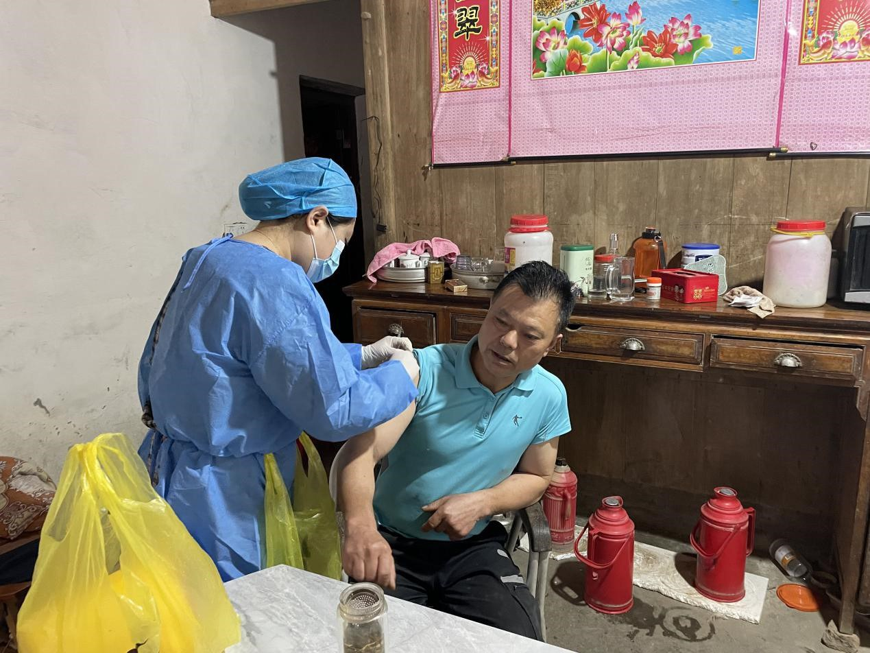 驻村第一书记带领防疫人员上门为村民接种新冠疫苗。