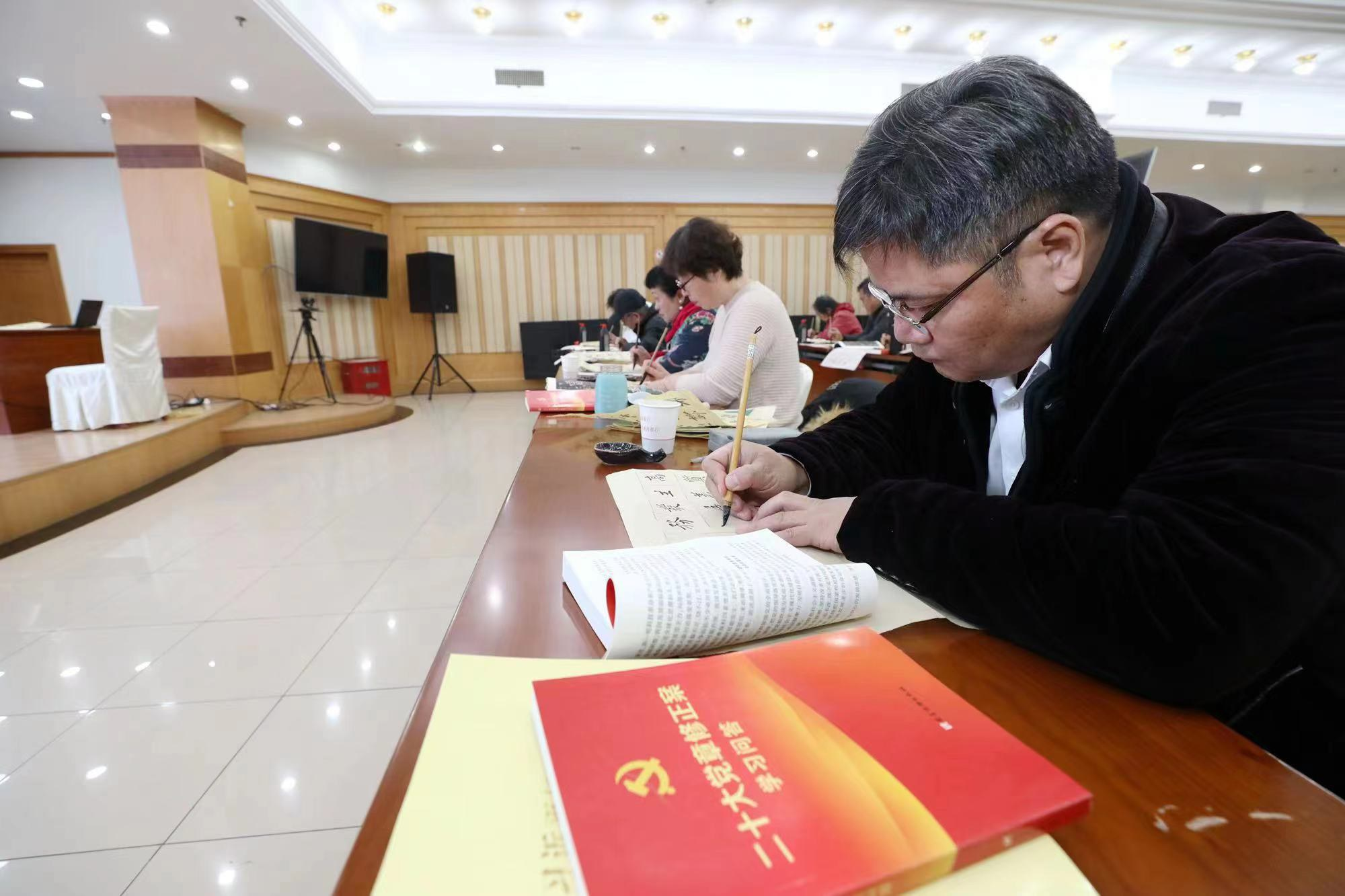 本报讯(赵红伟)为深入学习宣传贯彻党的二十大精神,进一步加强书香工行建设,近日,工商银行江苏省扬州分行在员工书法培训班开展“书金句,悟精神”活动,组织学员书写党的二十大报告金句,以书法艺术形式让二十大精神入脑、入心、入行。