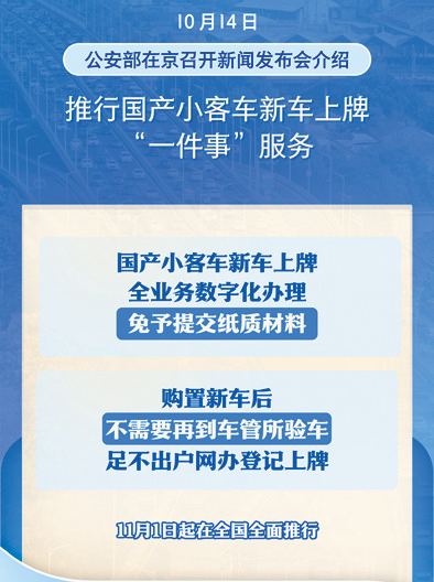 @新华社 公安部近日在京召开新闻发布会介绍,11月1日起在全国全面推行国产小客车新车上牌“一件事”服务,推动车辆销售发票、购置税、保险等信息共享核查,实现国产小客车新车上牌全业务数字化办理,群众免予提交纸质材料。同时,在“交管12123”App开发应用新车上牌模块,网上集成选车、购险链接和选号、上牌等服务,实现新车信息联网共享,群众购置新车后不需要再到车管所验车,足不出户网办登记上牌。公安交管“高效办成一件事”改革措施还包括:网上办理解除机动车抵押登记、大件运输车辆临时号牌、补换领机动车登记证书,机动车转籍信息网上转递,便利网上办理驾驶人考试业务,以及网上申请校车驾驶资格。