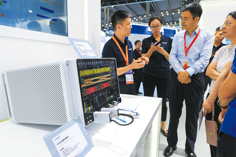 近日,2025湾区半导体产业生态博览会(湾芯展)在深圳开幕,本届湾芯展展览面积超6万平方米、参展企业超600家。比亚迪、富士康、大疆、长江存储、华虹集团等约5000名头部企业专业采购商参展,共享市场机遇。图为参观者在万里眼公司展台了解新一代超高速实时示波器。