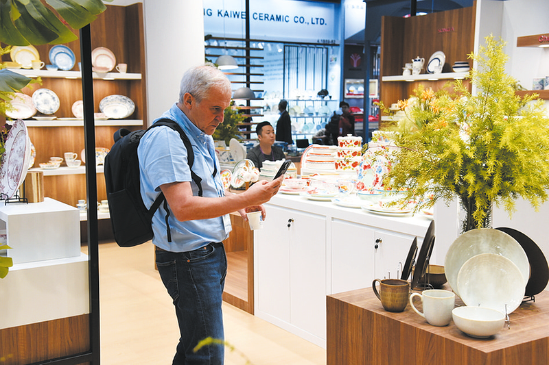 日前,第138届广交会第二期开幕,以“品质家居”为主题,集中展示家庭用品、礼品及装饰品、建材及家具3大板块。二期线下展览总面积51.5万平方米,展位2.5万个,参展企业超1万家。图为客商在拍摄瓷器展品。