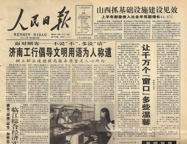 1995年8月7日,人民日报头版头条刊发济南工行倡导文明用语服务赢得社会赞誉的文章。