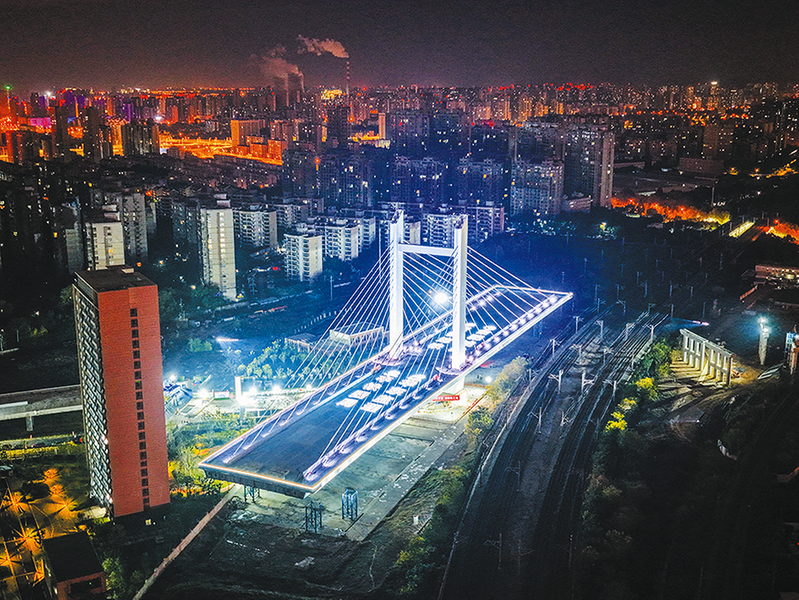 日前,经过120分钟连续精准作业,由中铁四局集团有限公司承建的合肥市淮南路独塔双肢双索面斜拉钢箱梁桥顺利完成转体,成功跨越合武绕行线、合蚌客专、淮南铁路等4条铁路干线。作为合肥市构建现代化综合交通体系的重要节点工程,淮南路涉铁工程全长661.5米,转体总重量1.9万余吨,转体角度达54.4度。图为涉铁桥梁正在转体。