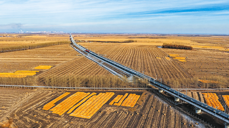 日前,在黑龙江省绥化市庆安县永华村哈伊高铁哈铁段铺轨现场,施工方中铁二局的四名工人手持电动扳手,将最后一对钢轨螺栓拧紧,标志着我国“十四五”规划重点工程哈伊高铁全线铺轨贯通,为后续联调联试奠定基础。据了解,哈伊高铁于2024年5月28日正式启动铺轨,是我国“八纵八横”高铁网京哈——京港澳通道的重要延伸,也是在建纬度最高、全年温差最大,且首条穿越多年岛状冻土区的高速铁路。图为哈伊高铁哈铁段铺轨现场。