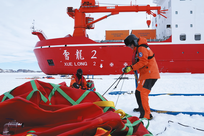 执行中国第42次南极考察任务的“雪龙”号近日顺利抵达南极中山站外围陆缘冰区域,与已于北京时间11月25日率先抵达的“雪龙2”号完成会合。目前,两艘极地考察船正协同开展中山站区域大规模卸货作业,计划在15天内累计完成约2000吨各类物资的卸运工作。据了解,这是“雪龙2”号首次承担南极考察站燃油补给任务,此举将进一步丰富我国极地科考补给的模式,提升补给效率与可靠性。图为工作人员在做油囊加注准备工作。