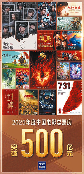@证券日报 据国家电影局数据,截至12月13日14时30分,2025年全年票房累计(含预售)达500.03亿元,较去年同期提升22%。这是继2017年、2018年、2019年和2023年之后,年度票房第五次突破500亿元大关。全年票房过亿元影片50部,其中国产影片33部,外国影片17部。根据猫眼专业版数据,年度票房前十名的影片目前分别为《哪吒之魔童闹海》《唐探1900》《疯狂动物城2》《南京照相馆》《731》《浪浪山小妖怪》《捕风追影》《封神第二部:战火西岐》《熊出没·重启未来》和《长安的荔枝》。这之中,国产片占据九席,动画电影占据四席,30亿元以上的影片共有四部,头部影片带动作用显著,仅《哪吒之魔童闹海》的单片票房就高达154亿元,占全年票房的30%以上。