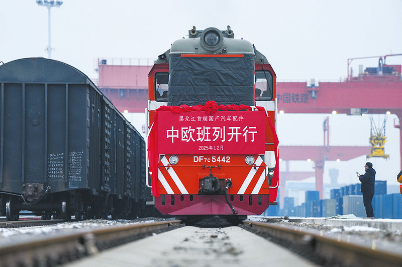 近日,中国铁路哈尔滨局集团有限公司今年首趟国产汽车配件中欧班列,在哈尔滨国际集装箱中心站缓缓启程。该班列编组55节,满载国产汽车配件,将经满洲里口岸出境,一路驶向欧洲市场。相较于传统运输模式,此次中欧班列运输优势显著:运输时间缩短2/3以上,物流成本降低25%以上,还能够有效避免设备在倒装过程中产生的磕碰损伤。图为满载国产汽车配件的中欧班列启程场景。
