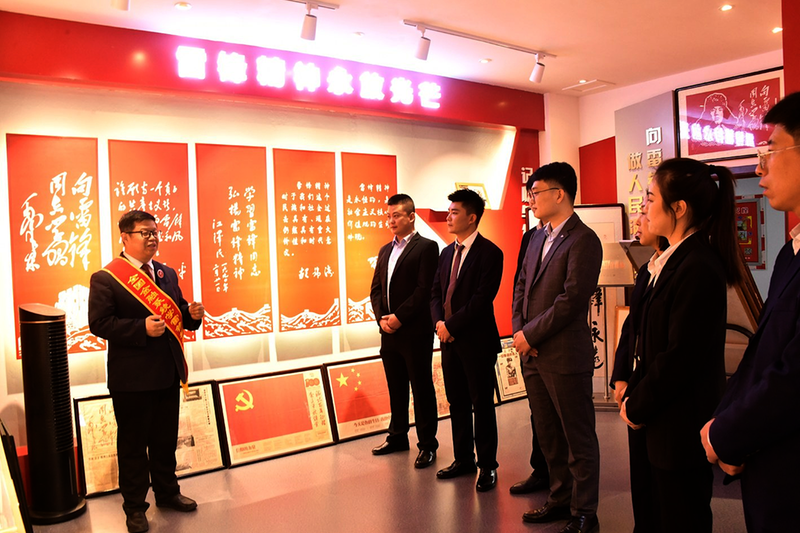 “弘扬雷锋精神——王建国工作室”馆长王建国(左一)为新入职员工讲授雷锋故事。