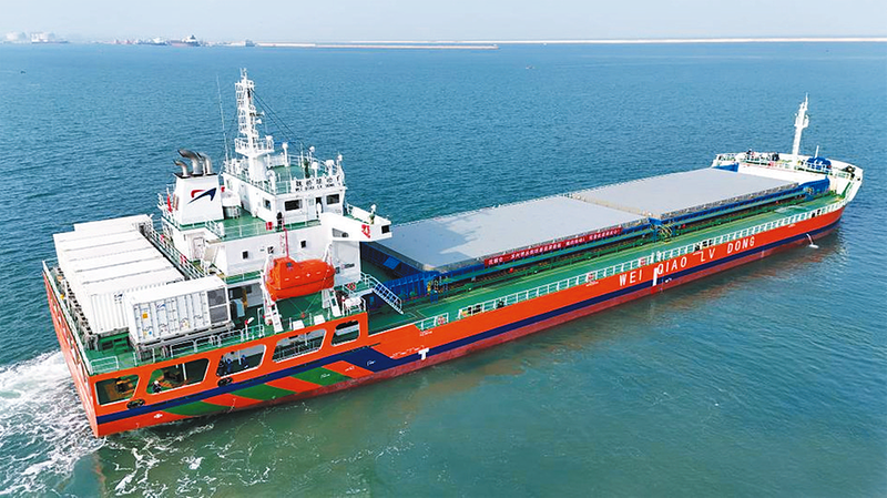 近日,国内首艘万吨级近海航区新能源散货船“魏桥绿动1”货轮从烟台港装满铝矾土,到山东省滨州市无棣创业码头停靠,进行卸货转运,并在码头首个充换电储能站给电池充电后返回烟台港。“魏桥绿动1”万吨级近海航区新能源散货船首航完成,标志着烟台—滨州渤海湾首个绿色航运物流通道打通。图为“魏桥绿动1”轮从烟台港西港区起航前往山东省滨州市无棣创业码头。