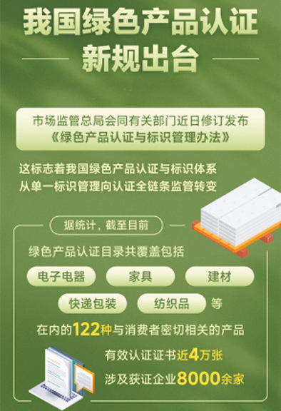 @新华社 近日,市场监管总局会同有关部门修订发布《绿色产品认证与标识管理办法》(以下简称《管理办法》)。这是我国首次对绿色产品认证活动系统性作出全面、统一规范,标志着我国绿色产品认证与标识体系从单一标识管理向认证全链条监管的重大转变。此次修订发布的《管理办法》立足“统一产品目录、统一评价标准、统一认证规则、统一产品标识”原则,聚焦绿色产品认证活动全过程监管,明确体系分级分类管理思路,清晰界定绿色产品全项认证与分项认证的适用场景。截至目前,绿色产品认证目录共覆盖包括电子电器、家具、建材、快递包装、纺织品等在内的122种与消费者密切相关的产品,有效认证证书近4万张,涉及获证企业8000余家。