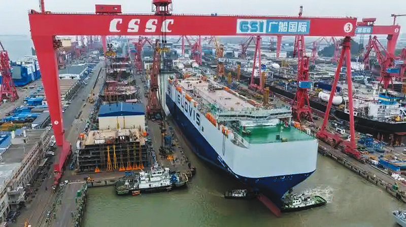 近日,由中船集团广船国际为韩国公司建造的10800车LNG双燃料汽车运输船1号船在广州南沙出坞,这是目前国内建造的最大汽车运输船。该船采用LNG+燃油的双燃料动力系统,满足国际海事组织Tier Ⅲ排放标准。该船船长230米、型宽40米、结构吃水10.5米,兼顾环保与高效。其14层汽车甲板设计(含5层活动甲板)可灵活装载电动汽车、氢能源汽车及重型卡车等多元货物,单船最大载车量可达10800辆。图为10800车LNG双燃料汽车运输船1号船在南沙出坞。 中新社供图
