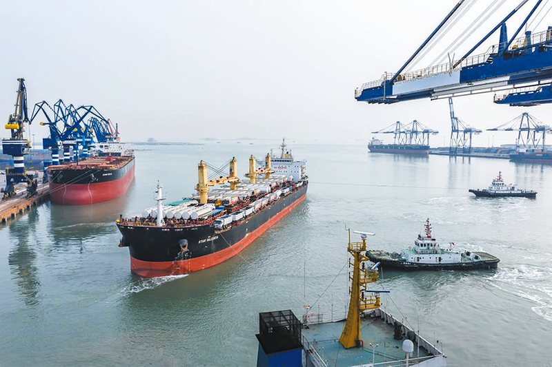 近日,山东港口烟台港正式开通塞内加尔航线。目前,烟台港国际航线已增至150余条。图为“烟台港—塞内加尔达喀尔港”航线首班货轮从山东港口烟台港起航。