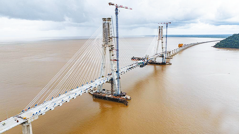 近日,随着最后一方混凝土精准泵送到位,由中铁大桥局承建的马来西亚在建最大单体桥梁项目——鲁巴跨海大桥顺利合龙。这座全长4844米的“海上巨龙”,将彻底终结鲁巴河入海口两岸数十年仅靠轮渡通行的历史。项目建成后,不仅能显著优化沙捞越州沿海交通格局、大幅缩短区域通勤时长,更将为当地油气、农业等资源开发及旅游业发展注入强劲动能,成为中马建交50余年来友好合作的又一标志性丰碑。图为鲁巴跨海大桥合龙现场。