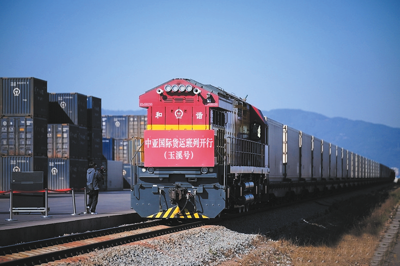 近日,满载云南新鲜蔬菜和优质钢材等货物的中亚班列,从云南玉溪中老铁路研和站驶出,这趟班列将通过磨憨口岸出境至老挝万象南站。这是今年中老铁路新增4趟中亚班列的首趟,相关货物跨越国境后,将奔赴老挝、泰国等国家和地区销售。图为中老铁路中亚国际货运班列在云南玉溪市研和站发车。