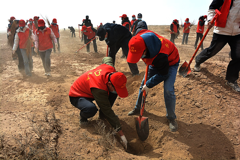 青年代表配合默契,在沙地种下一株株梭梭苗。